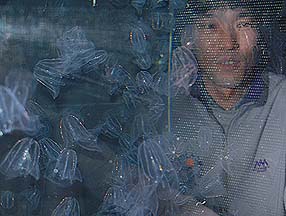 水槽のガラスの向こうで熱心に説明してくださっているのがこのクラゲたちを 慈しみ育てている 水族館の奥泉さん。ある意味、自分の子供以上に手をかけているとか。